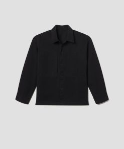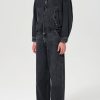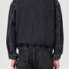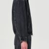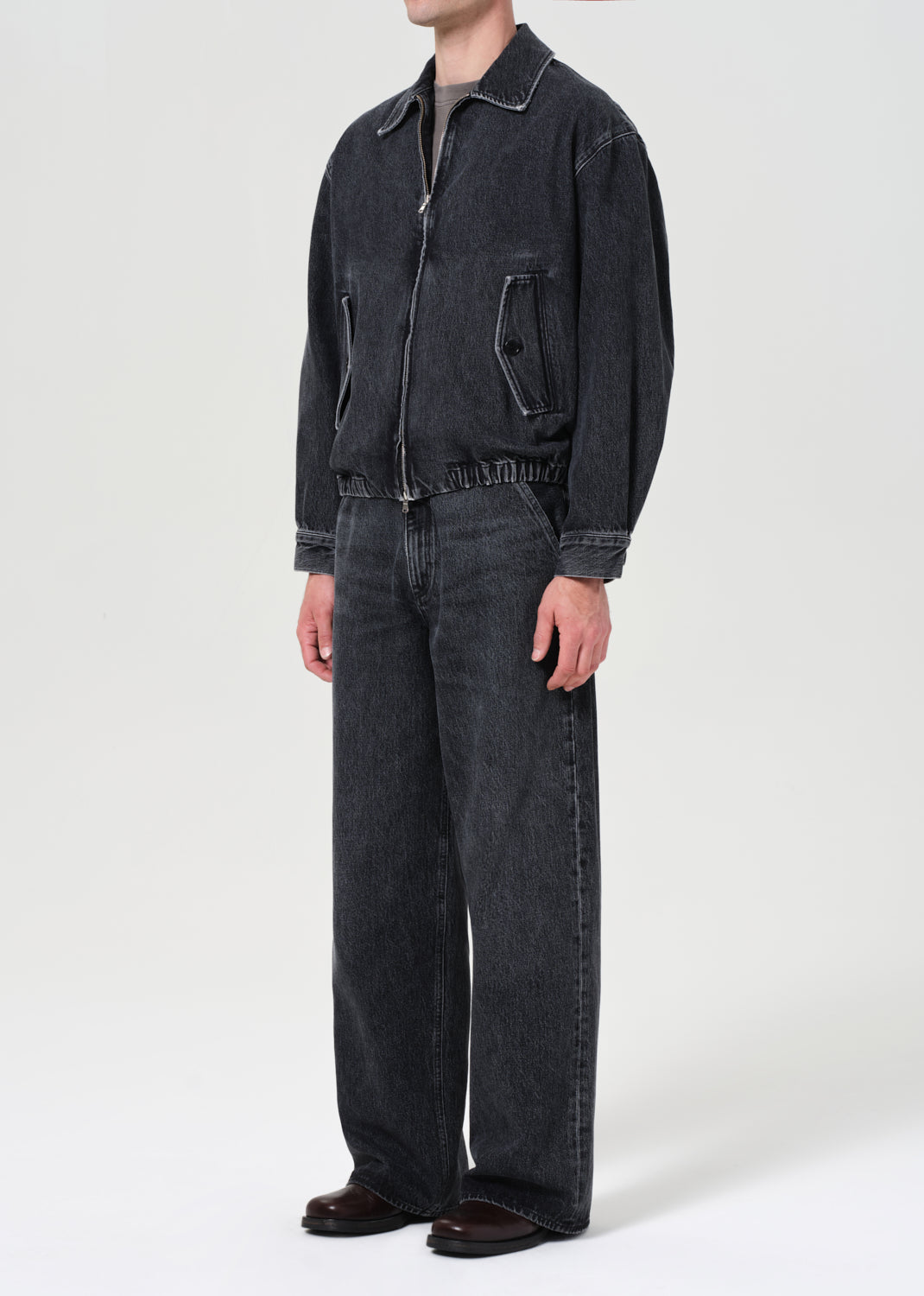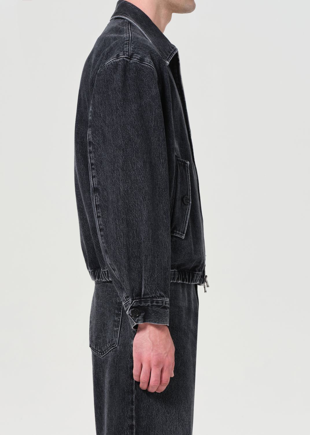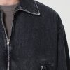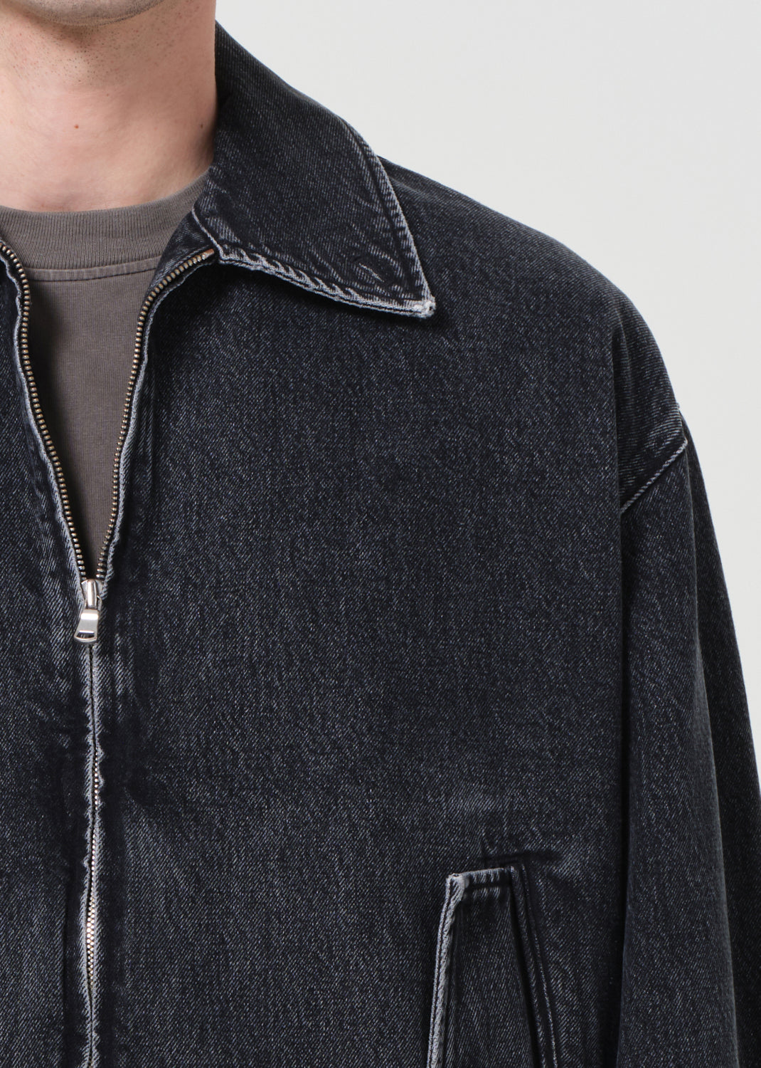 Worn-in washed black denim with a pointed collar and zipper front closure.