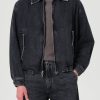 Looks Like: Worn in washed out black jacket with a pointed collar and a zipper front closure