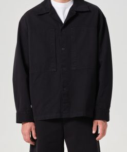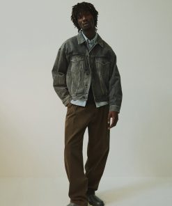 Worn-in washed black denim with a pointed collar and zipper front closure.