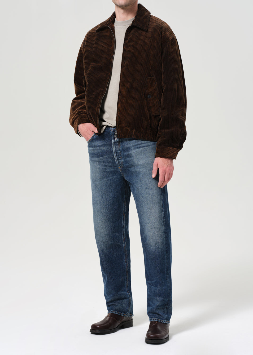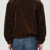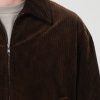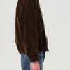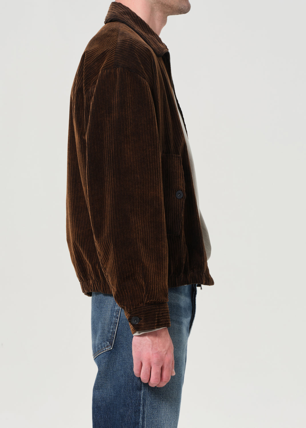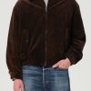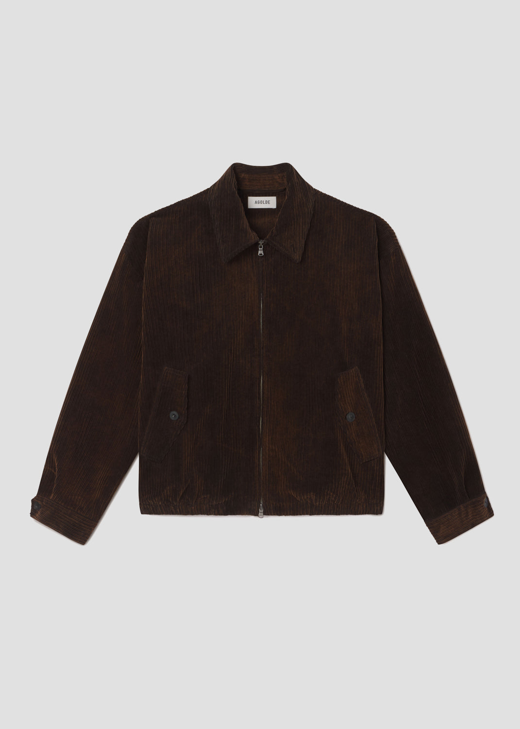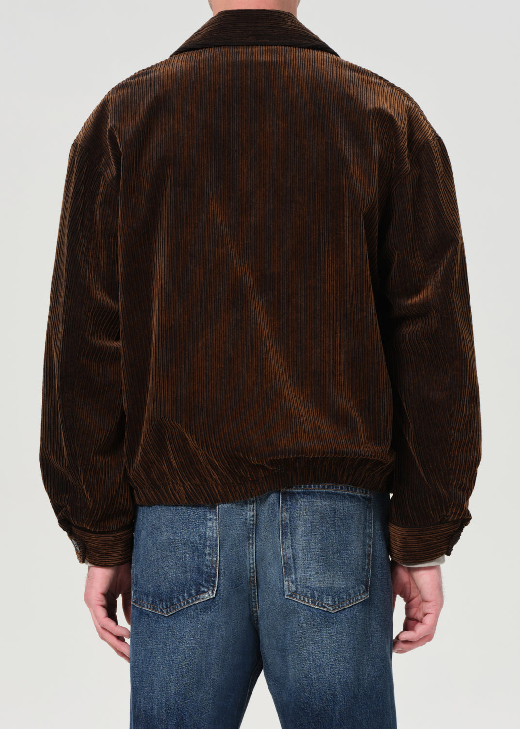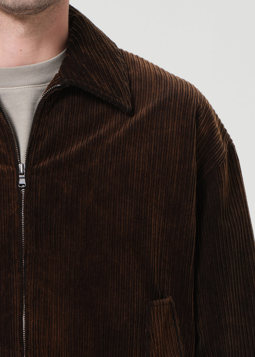 Dark brown velvet corduroy jacket with a zipper front closure.