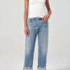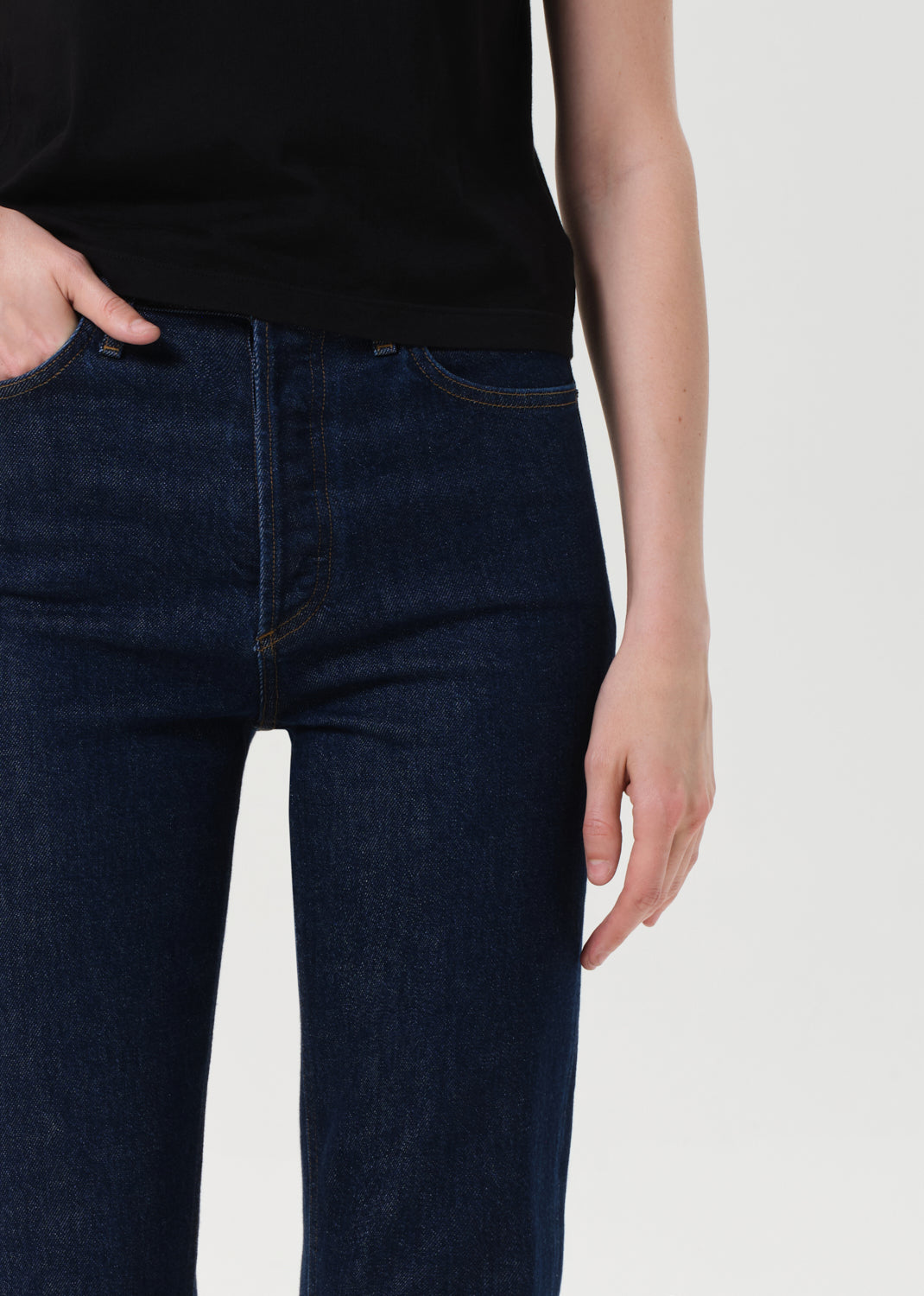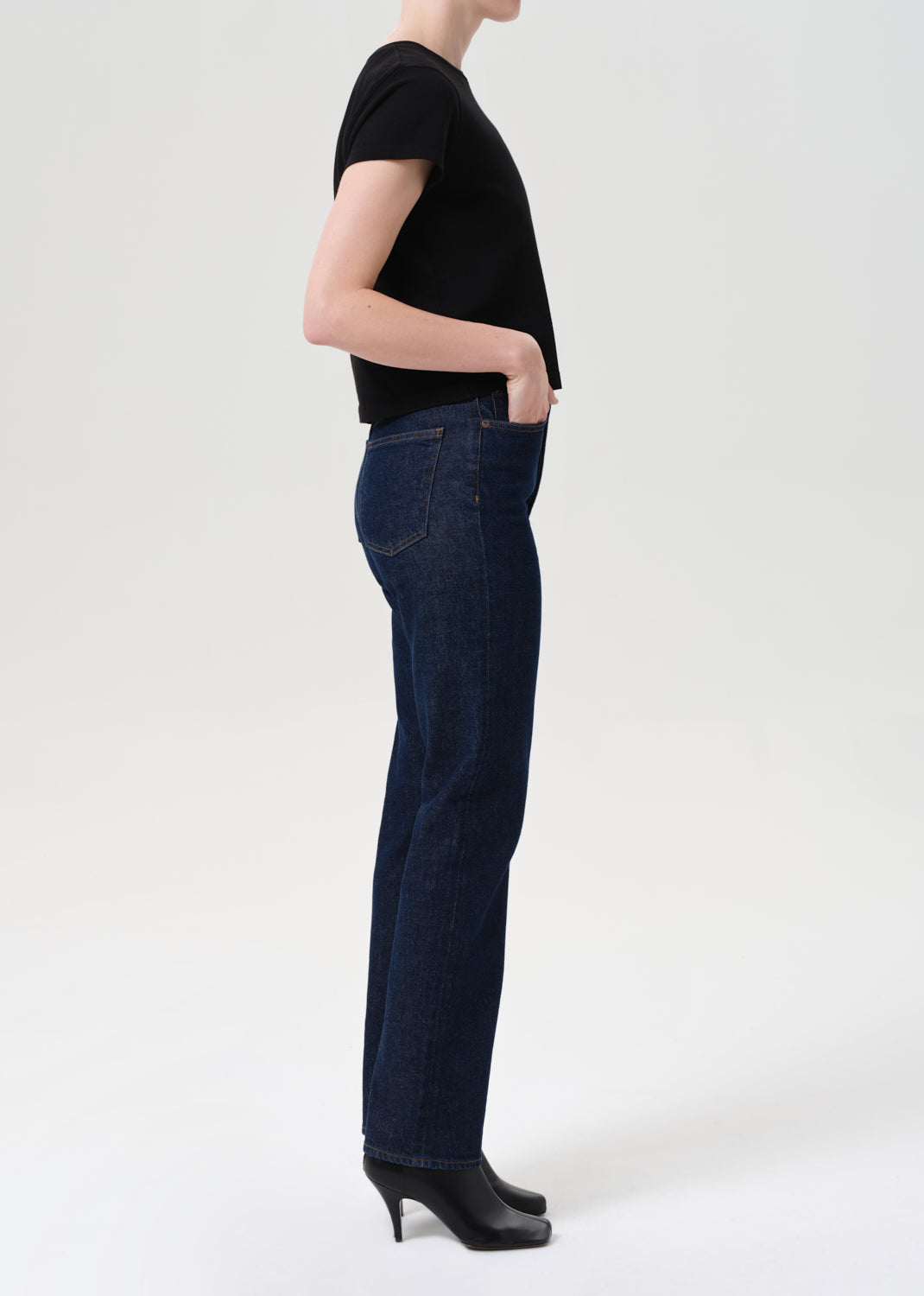 The 90’s Pinch Waist Long in Reissue is crafted in a true rinsed indigo wash for a timeless, polished look. Made from heavyweight comfort stretch denim, it combines structure with a soft hand for comfortable, all-day wear. The high-rise, straight-leg fit and 32″ inseam create a clean, elongating silhouette.