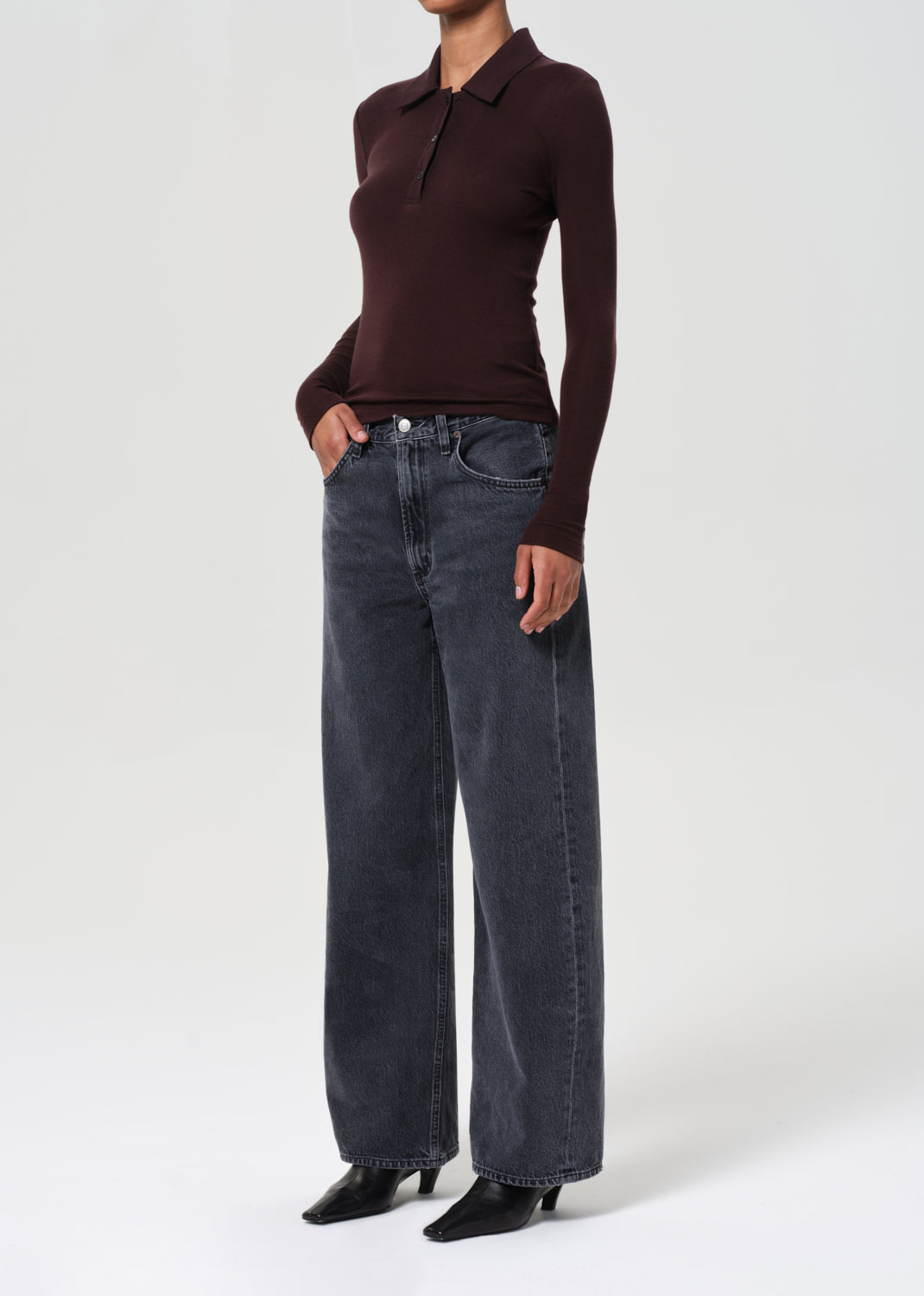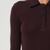 The Amos Polo in Root is a long sleeve henley polo featuring a sharp pointed collar. Made from ultra-soft, lightweight fine needle fabric, it offers a sleek, refined fit. The deep dark brown tone adds a sophisticated touch, making it versatile enough to pair with high-waisted denim for an elevated look or tuck into tailored pants for a chic, polished vibe.