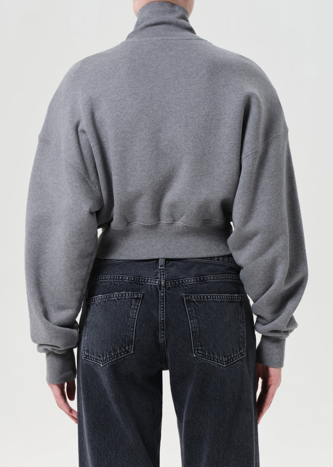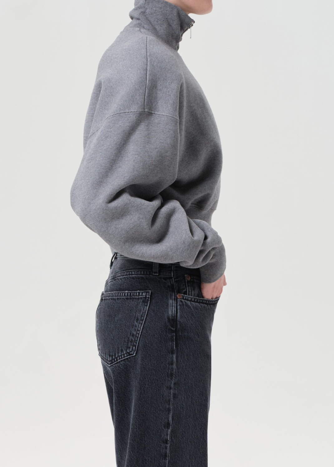 The Darby Zip Up is a high-collared sweatshirt with a cropped, boxy fit and exaggerated ribbed hem. Made from breathable, soft cotton fleece with a natural drape, it’s offered in a medium grey for an easy, go-with-everything tone. Pair with relaxed denim or layered sweats for a modern, off-duty uniform.