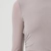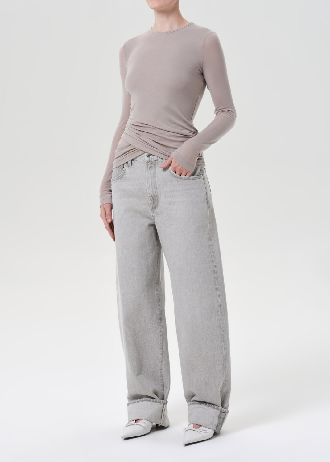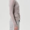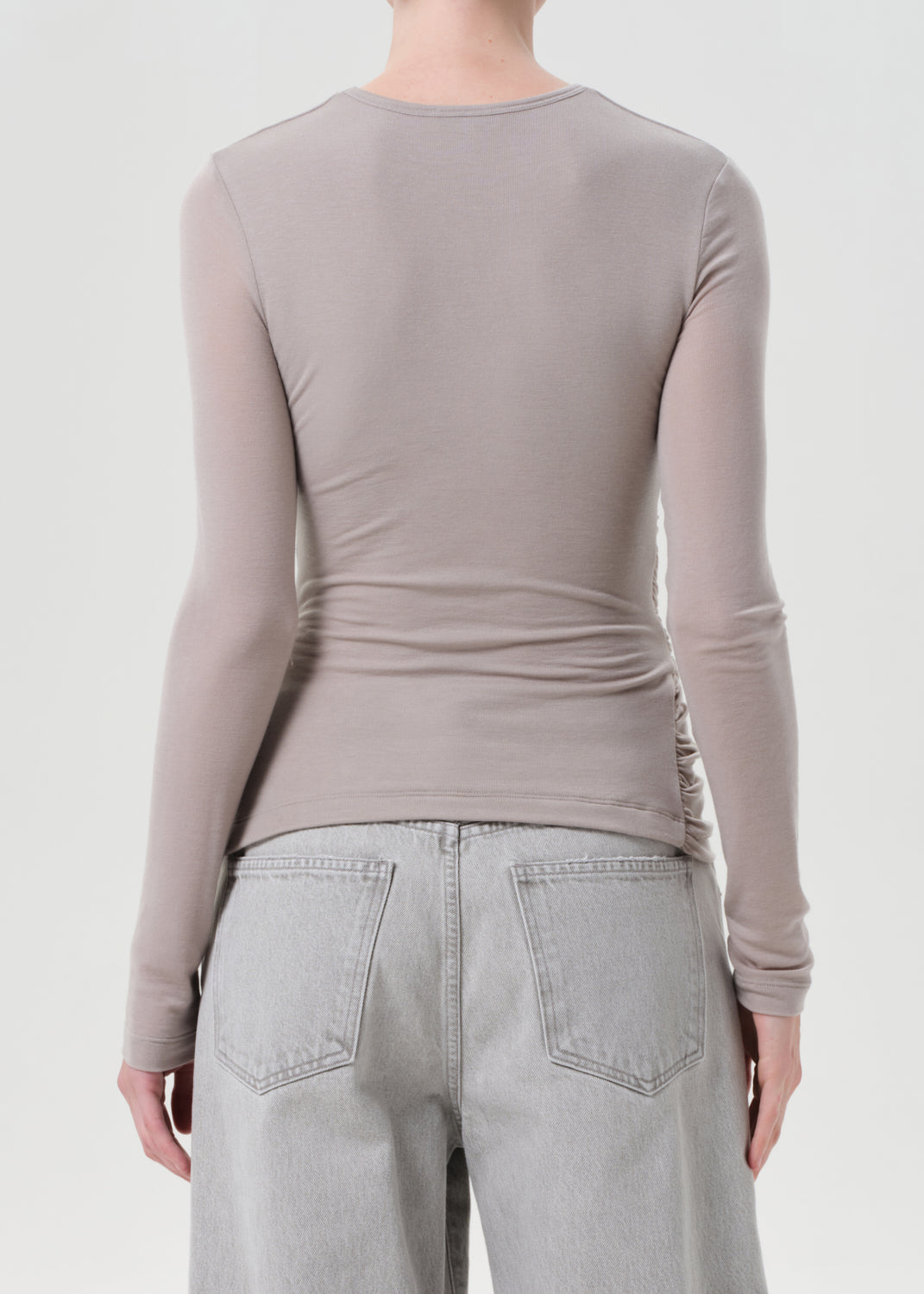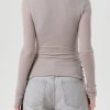 Looks Like: Greyish taupe long sleeve crewneck tee with front twist detailing at the hem line