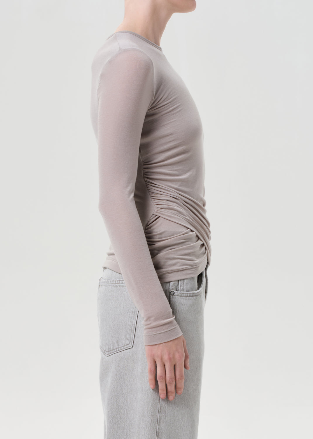The Eve Twist Tee is a long sleeve crewneck with subtle front twist detailing at the hem for a softly draped effect. Form-fitting and flexible with a refined feel. Style it with high-rise denim or layered under jackets for a sleek, everyday base.