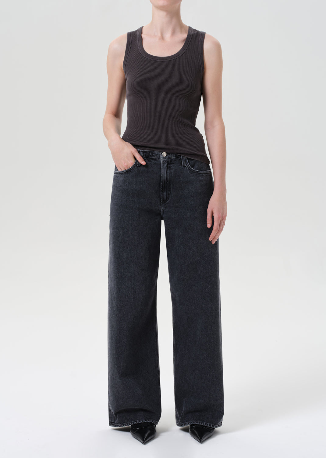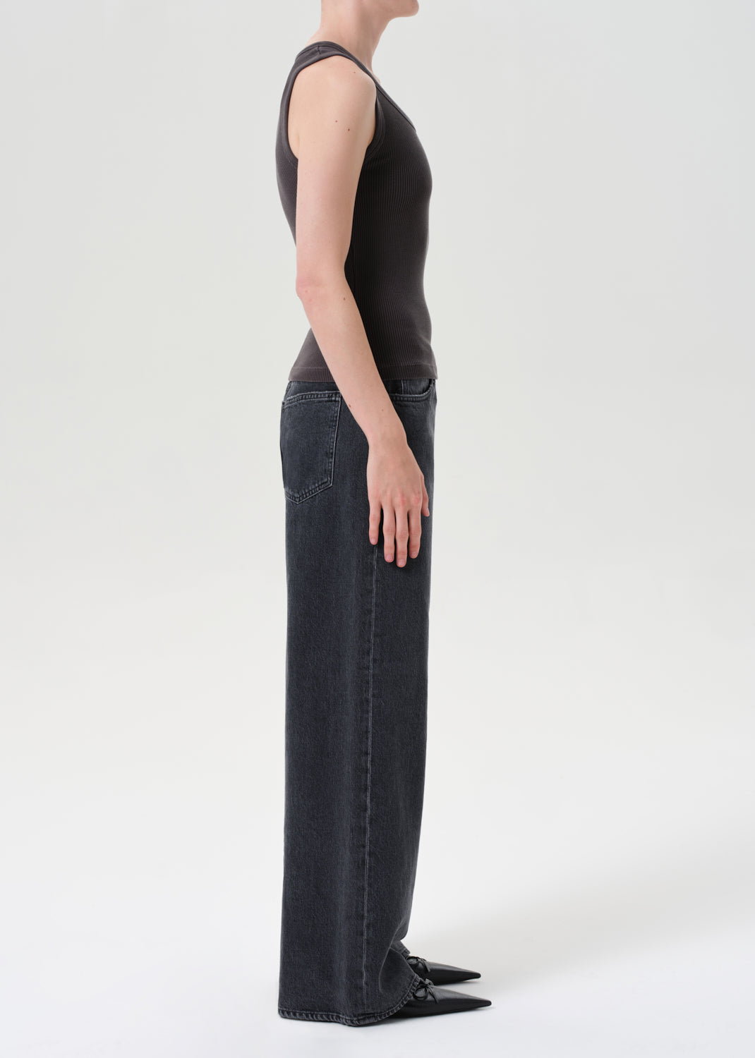 Looks Like: Medium washed out black denim pant