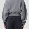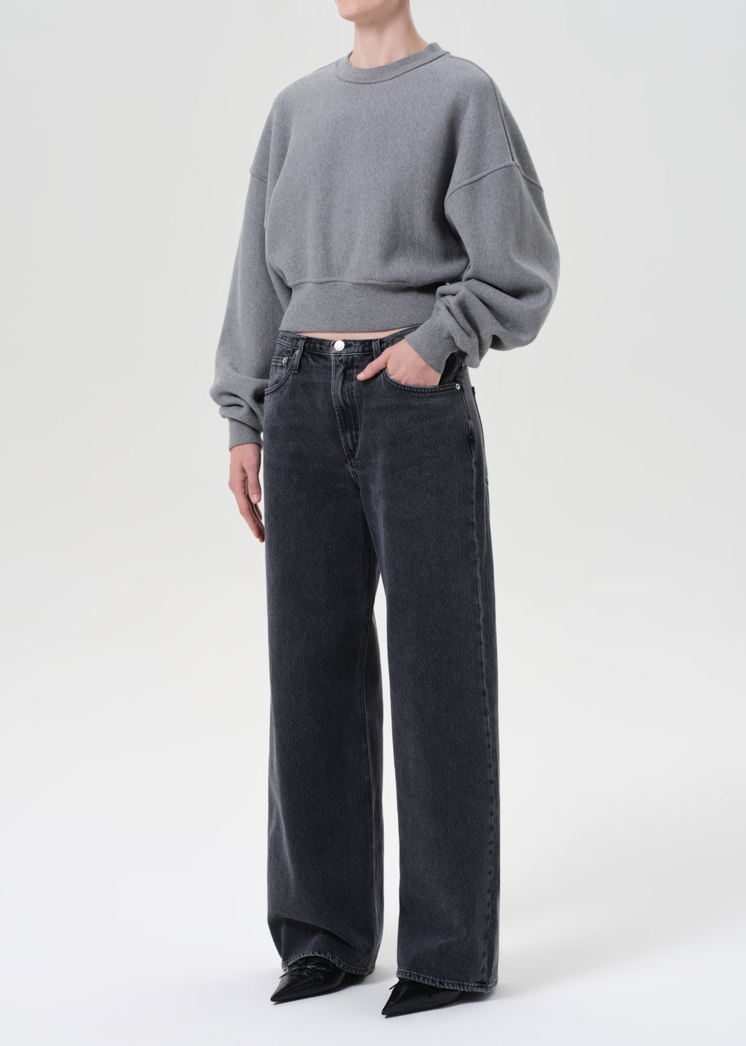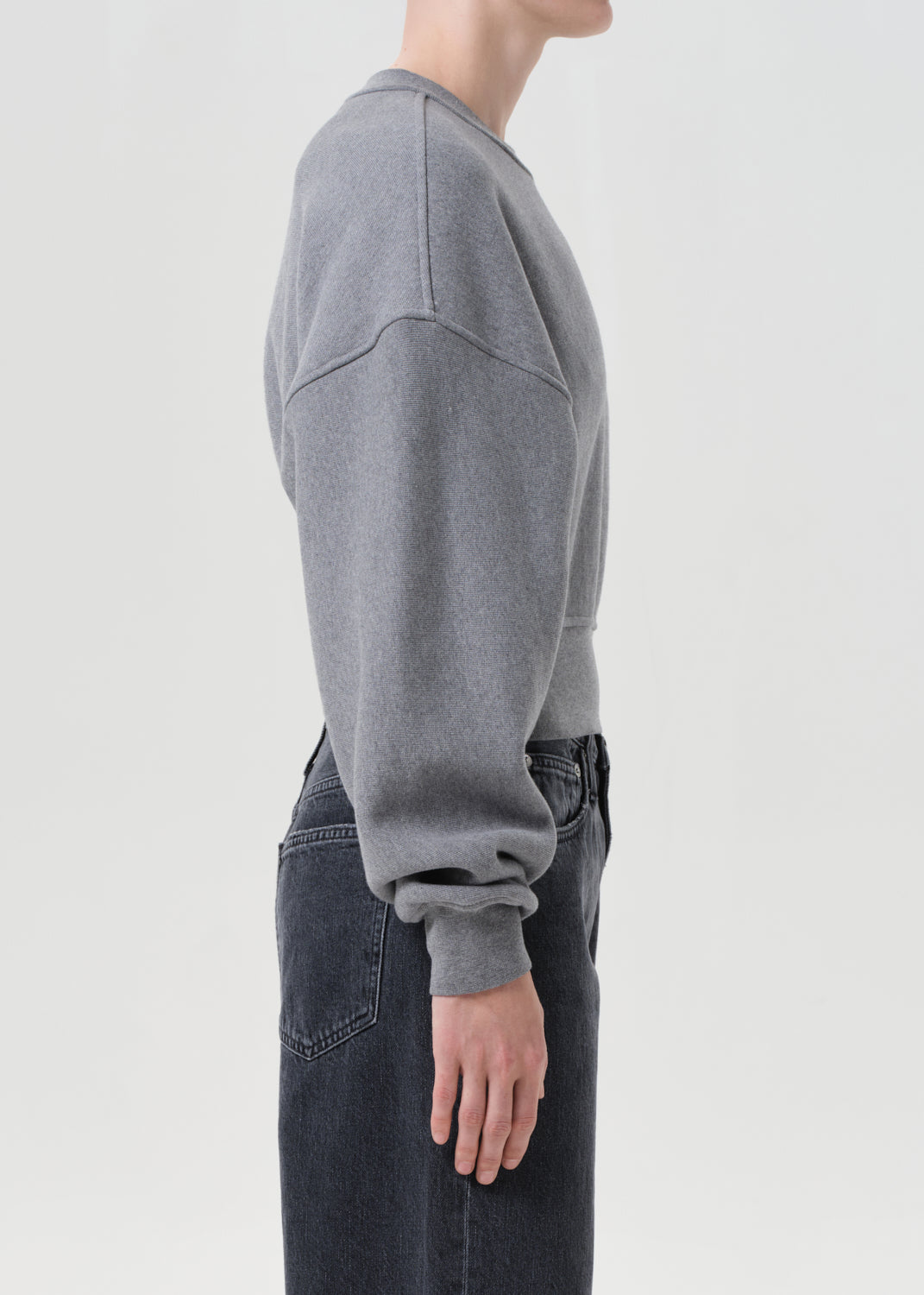 Looks Like: Medium grey cropped crewneck sweatshirt with elastic at hem