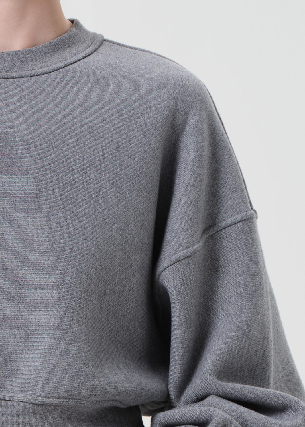 A fresh take on a classic crew, the Kit Sweatshirt features a cropped length with subtle volume and an elasticated hem for a modern shape. Crafted from breathable cotton fleece with a soft drape, this medium grey layer is designed to wear effortlessly on repeat. Pair with structured denim for a casual-cool balance.