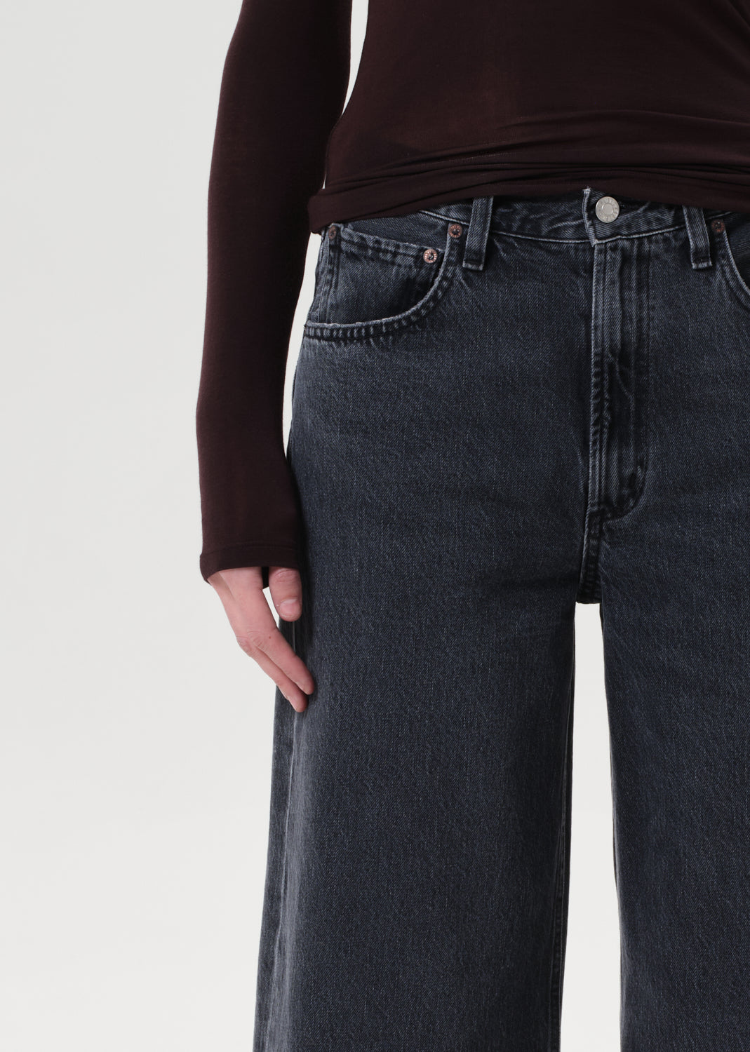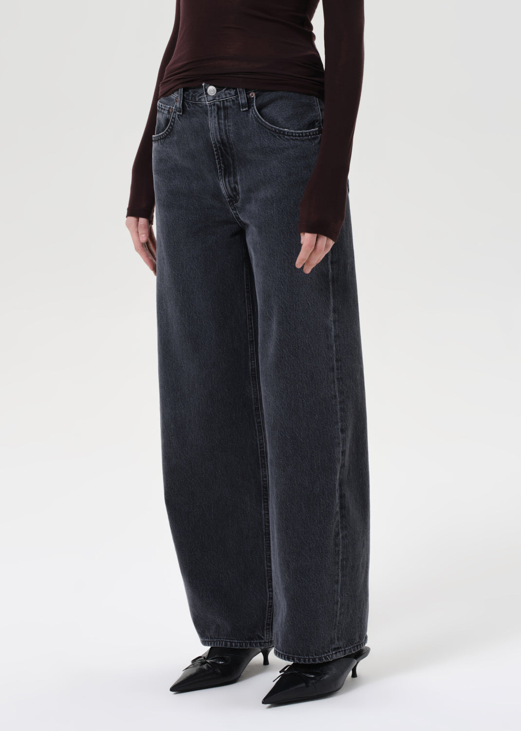 The Low Curve Jean features a relaxed, tapered leg and slouchy fit that sits low on the hips. Crafted from weightless, non-stretch denim with a soft hand, this washed-out black finish is detailed with subtle marbling and whiskering. Pair with a slim tank or boxy tee.