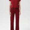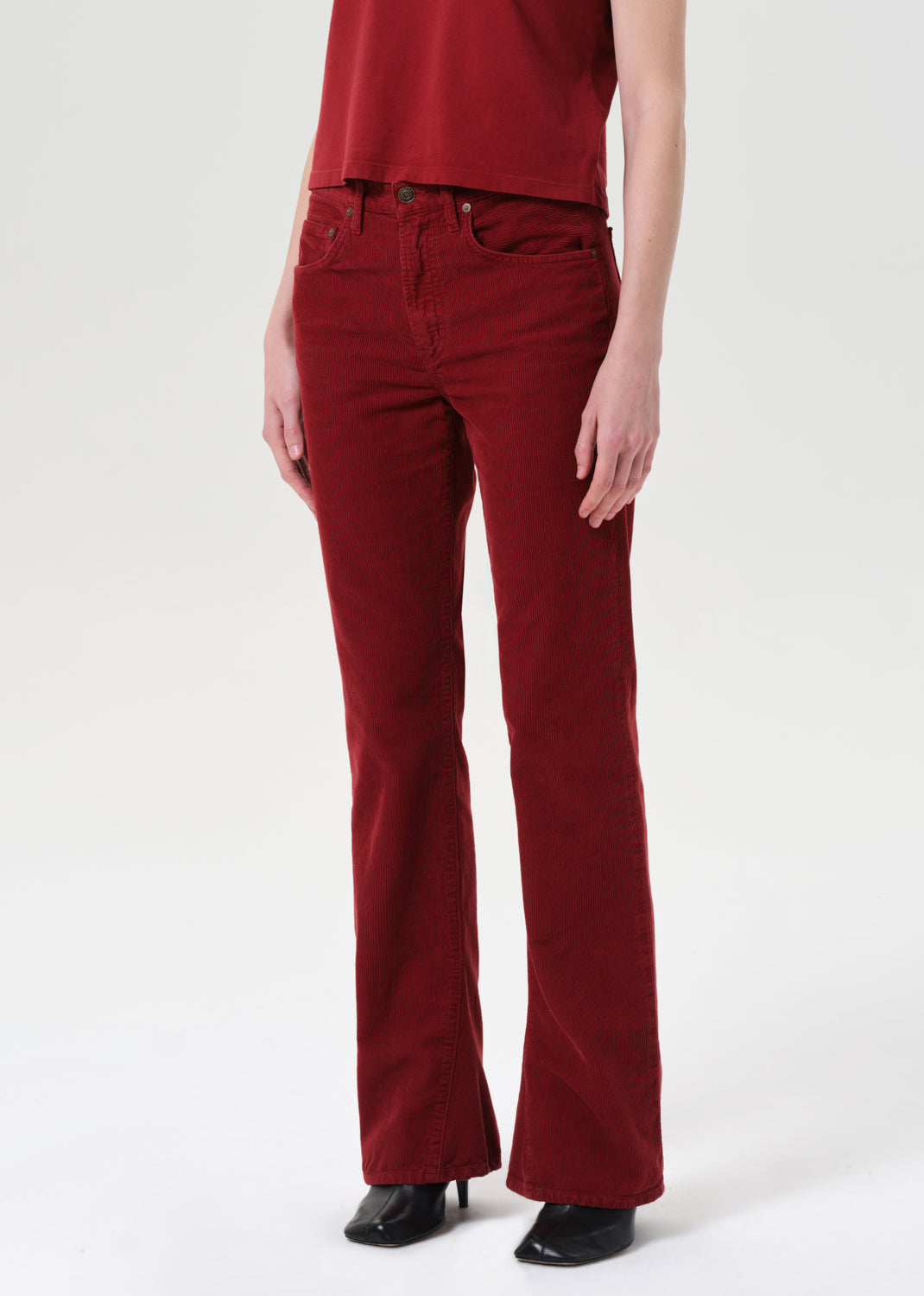 A vintage-inspired silhouette reimagined in plush, velvety corduroy. The Kick Boot sits at the mid waist with a slim fit through the thigh before subtly flaring at the ankle—an effortless nod to retro tailoring. Crafted from a rich, dark red cotton cord with a super soft hand feel. Pair with a sleek turtleneck or go monochromatic with a tonal tee.