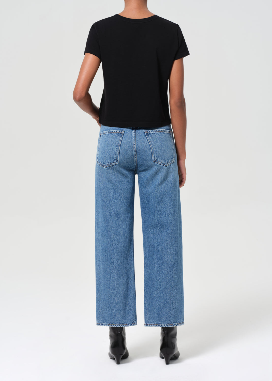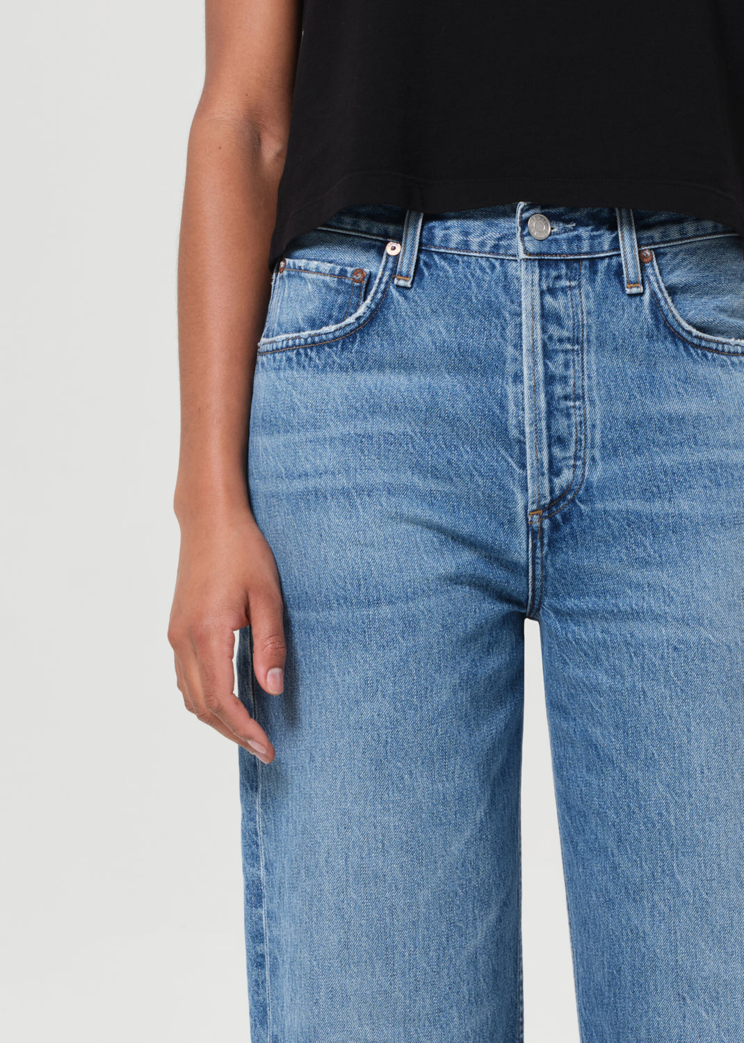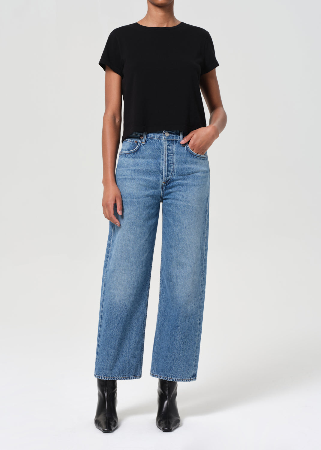 AGOLDE’s Ren jeans from the Weightless Collection offer the perfect blend of comfort and style. Made from regenerative cotton, they feature a high-rise waist and cropped wide legs for a relaxed yet flattering silhouette. The lightweight fabric ensures all-day comfort, making them ideal for casual wear. Pair them with a half-tucked tee for a cool, effortless look.