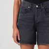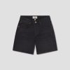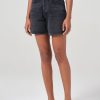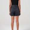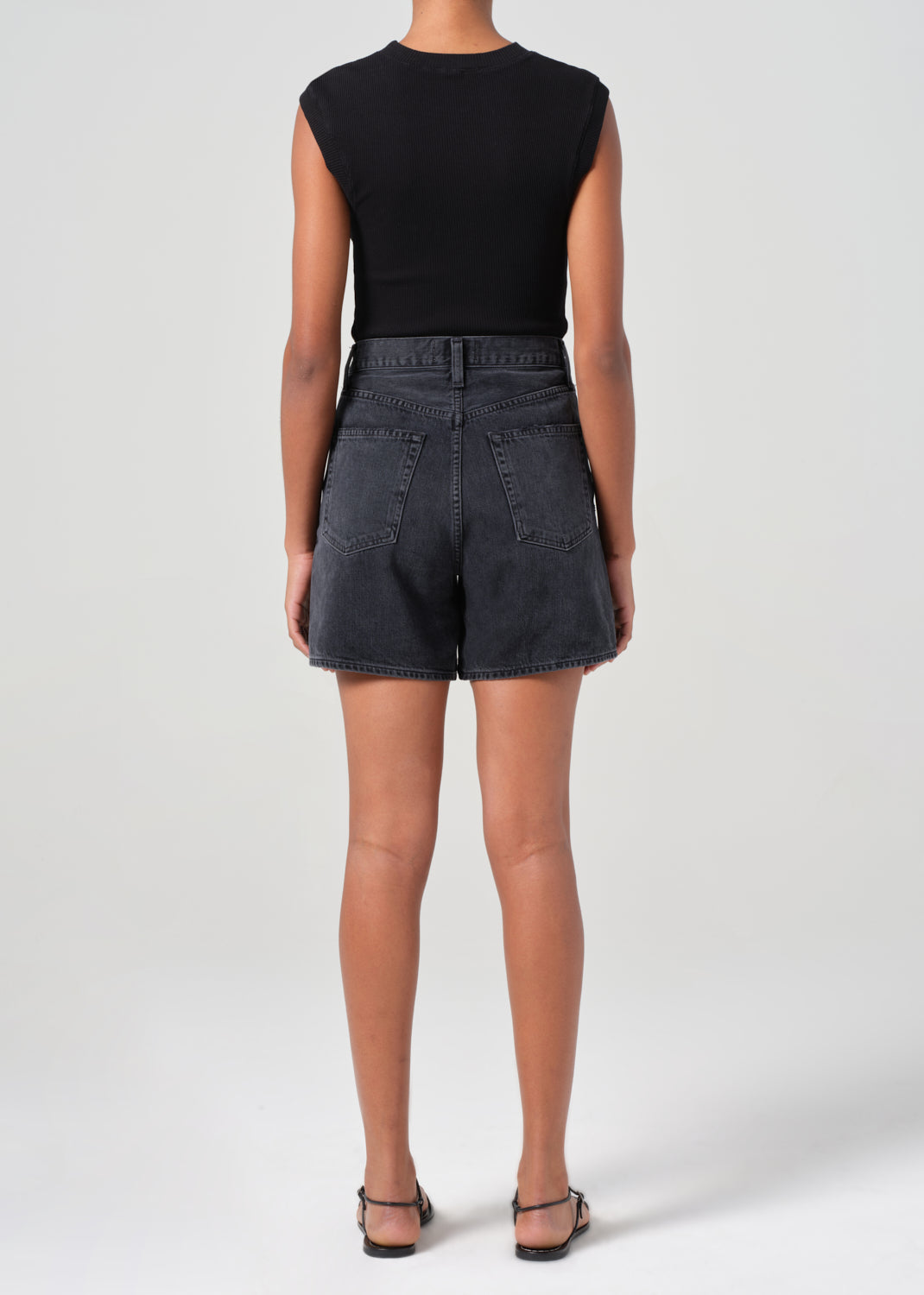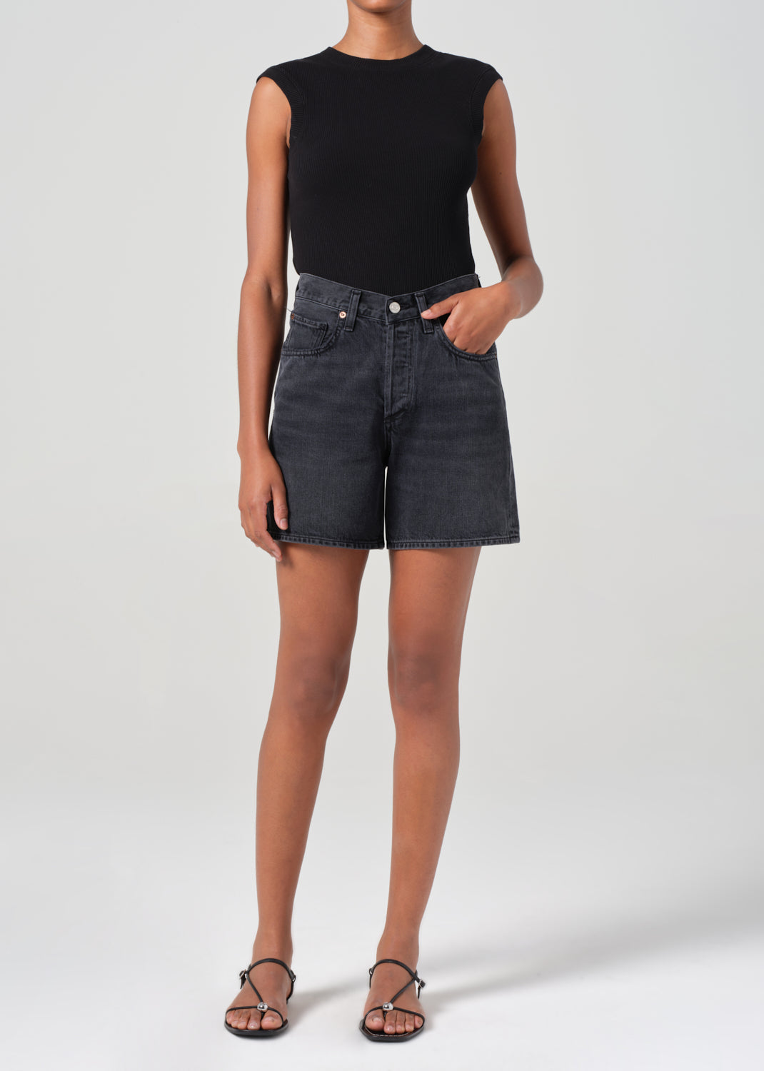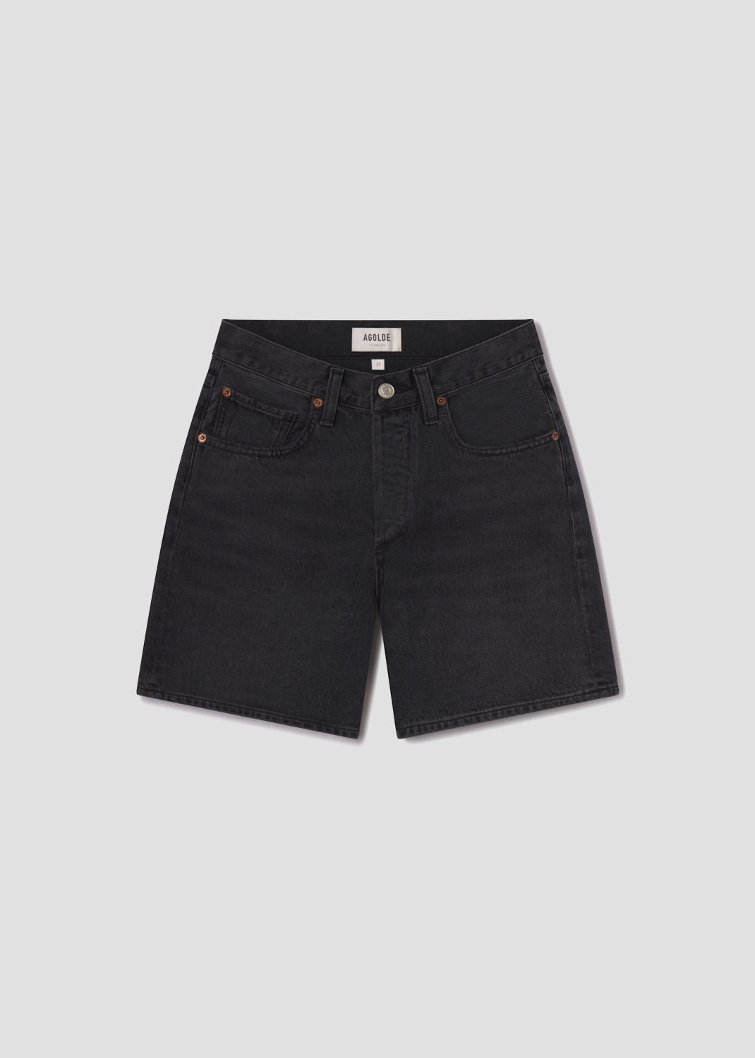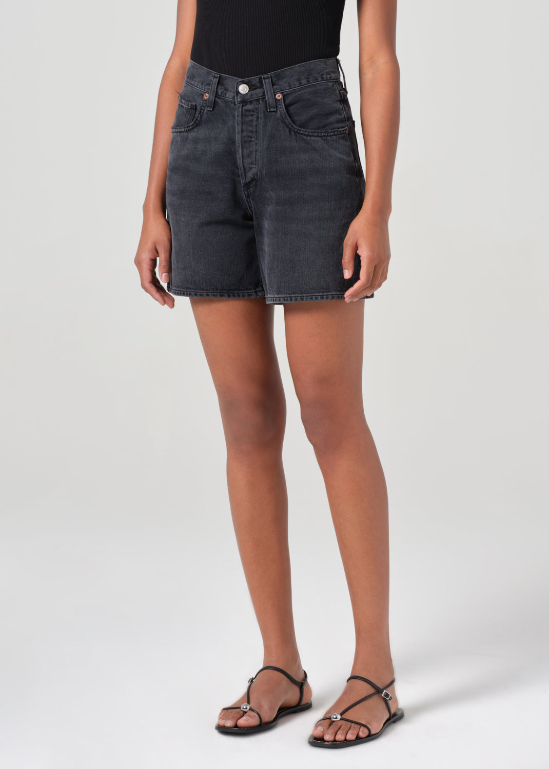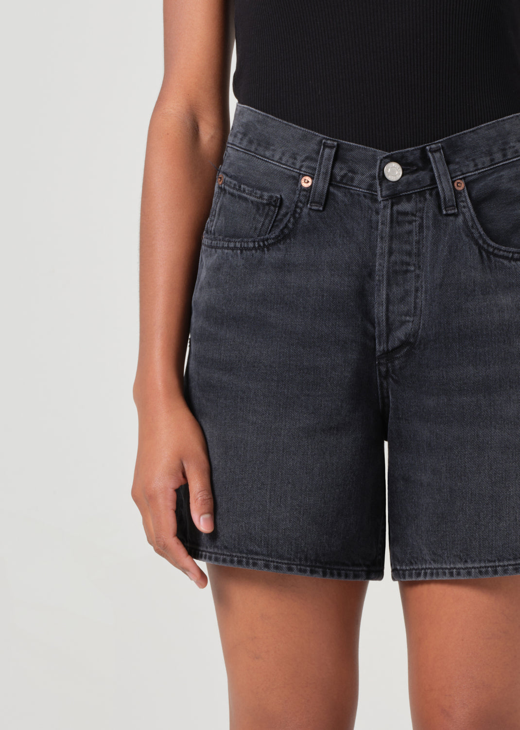 Looks Like: Washed out black denim short with clean hem and a V shaped front rise