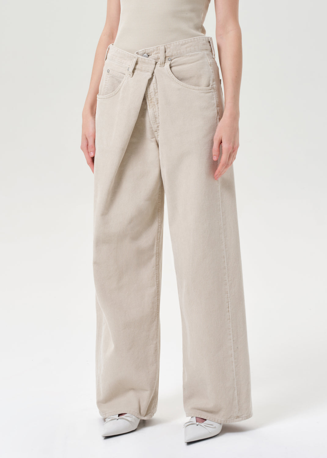 Looks Like: Light beige corduroy pant with fold detailing at the waistband